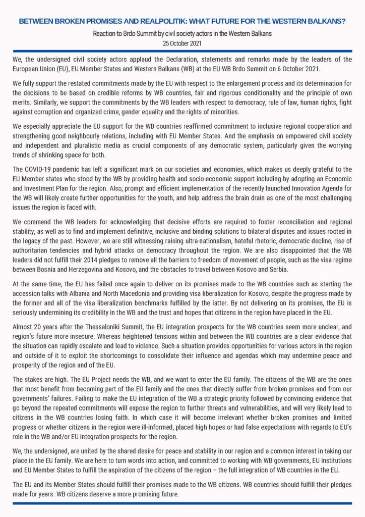 Reaction to EU Brdo Summit by CSO actors in Western Balkans